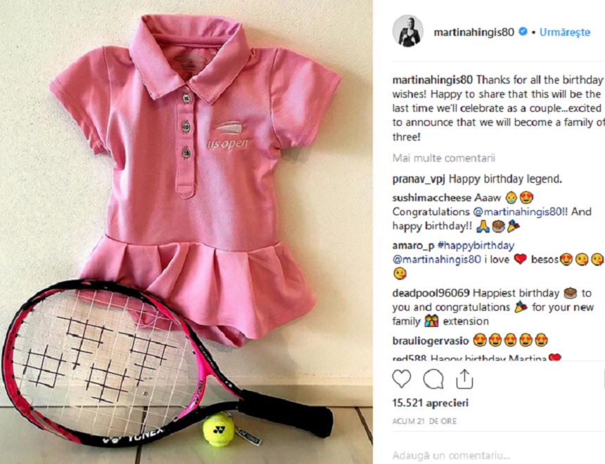 Alături de aceste cuvinte, Martina Hingis a pus o fotografie cu o rochiță roz, o rachetă şi o minge de tenis, semn că jucătoarea din Elveţia aştepată o fetiţă şi că speră că aceasta îi va călca pe urme.