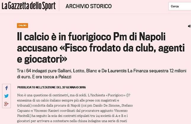 Cazul numit "Offside" a început la Napoli în 2012, unde patru procurori au detectat o reţea în care sunt angrenate 35 de cluburi din Serie A şi B, precum şi peste 100 de persoane. Mecanismul fraudulos priva Statul italian de încasarea taxelor provenite din tranzacţiile comerciale privind transferurile de jucători.