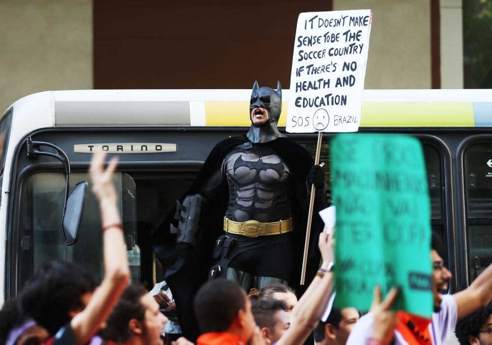 În timp ce lucrurile sunt pline de culoare pe stadion, pe stradă se desfăşoară proteste violente. Poliţiştii au folosit chiar gaze lacrimogene pentru a-i împrăştia pe protestatari. În urma conflictelor, un protestatar a fost arestat, iar un reporter a fost rănit. Oamenii sunt nemulţumiţi de cheltuielile uriaşe făcute pentru organizarea turneului.