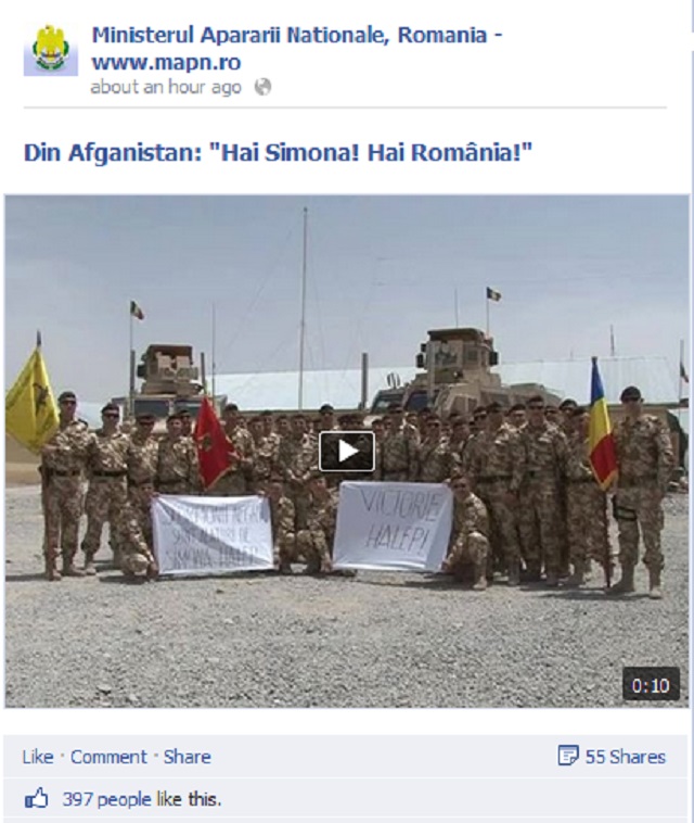UPDATE 12:36 Pe contul de socializare al Ministerului Naţional al Apărării militarii din Afganistan au postat un filmuleţ în care o încurajează pe talentata sportivă.