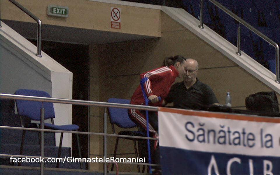 Cătălina Ponor în cârje, susţinută de antrenorul ei Octavian Bellu.